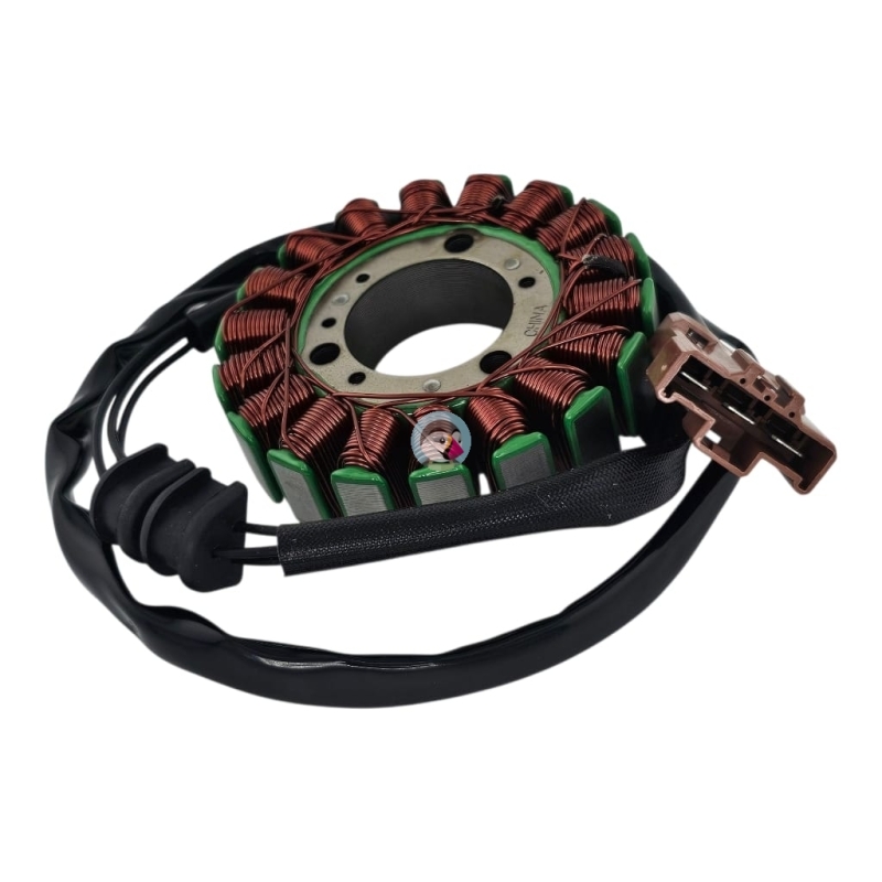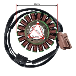 Stator kompletny, z impulstaorem, do silników GY6 125, montowanych w maxiskuterach, lub pojazdach typu ATV.Wymiary: 11 cewek, 1 cewka główna, 6 pinów ( kostka 4 piny i 2 piny osobno ), średnica zewnętrzna: 88mm , rozstaw otworów mocujących 41mm.