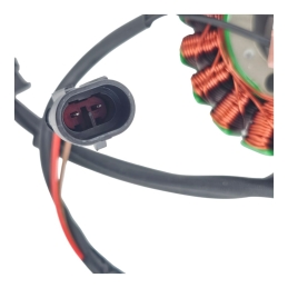 Stator kompletny z impulsatorem, do motocykli typu cross 125cm3, z rozruchem nożnym.Elementy charakterystyczne: 1 x cewka główna, 1 x cewka dodatkowa, impulsator, oring na rancie podstawy isktownika