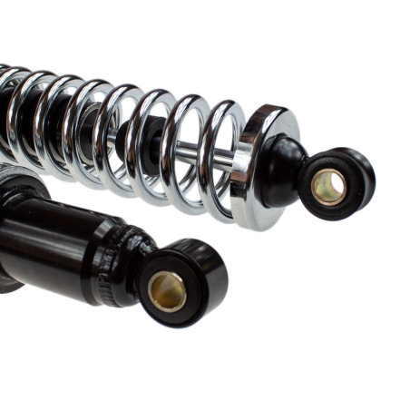 Komplet dwóch amortyzatorów, do motorowerów Romet Ogar200, Romet Ogar205, Romet Pony Motorynka M2 M3 301. Amortyzatory wykonane na wzór oryginalnych amortyzatorów. Sprężyna chromowana.