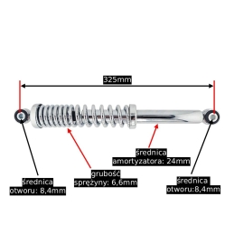 Komplet dwóch mortyzatorów, do motorowerów Romet Komar, Ogar, Kadet, Motorynka, Jawa50, Jawa20, oraz pojazdów ATV. Wymiary podstawowe: długość całkowita 325mm ; średnica mocowania górnego: 8mm ; średnica mocowania dolnego 8mm