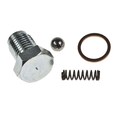 Śruba do zatrzasku skrzyni biegów, pod silnikiem. Komplet ze sprężynką, kulką i podkładką uszczelniającą.