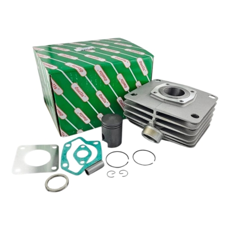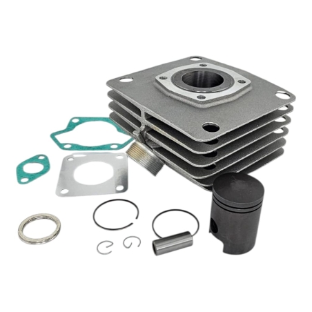 Cylinder żeliwny, chłodzony cieczą, o pojemności 50cm3, do motorowerów z silnikami AM6.Zestaw zawiera: cylinder, tłok, pierścienie, sworzeń, zabezpieczenia sworznia, uszczelki.