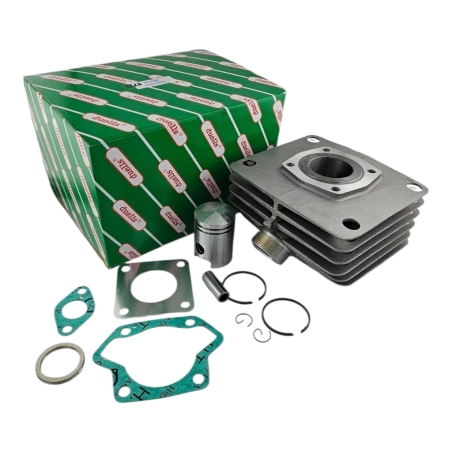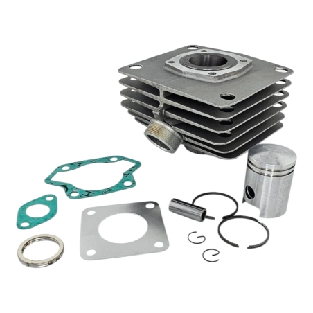 Kompletny cylinder żeliwny o pojemności 50cm3, do skuterów z silnikami Piaggio AC (chłodzonych powietrzem). W skład zestawu wchodzi: cylinder, tłok, pierścienie, sworzeń, zabezpieczenia i uszczelki. Standardowy zamiennik oryginalnego produktu.