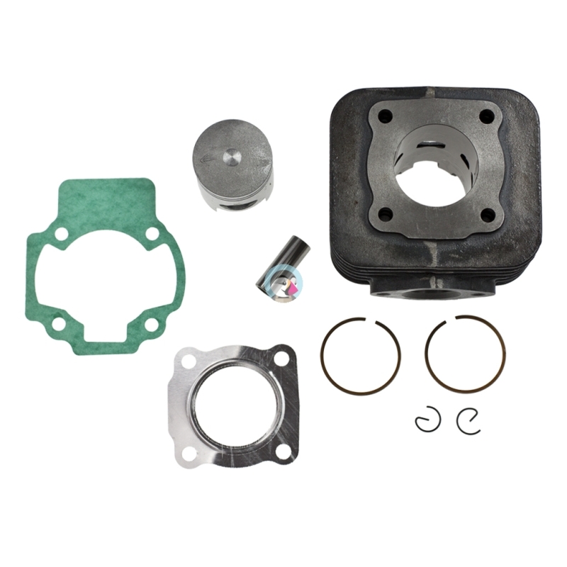 Kompletny cylinder żeliwny o pojemności 50cm3, do skuterów z silnikami Piaggio AC (chłodzonych powietrzem). W skład zestawu wchodzi: cylinder, tłok, pierścienie, sworzeń, zabezpieczenia i uszczelki. Standardowy zamiennik oryginalnego produktu.