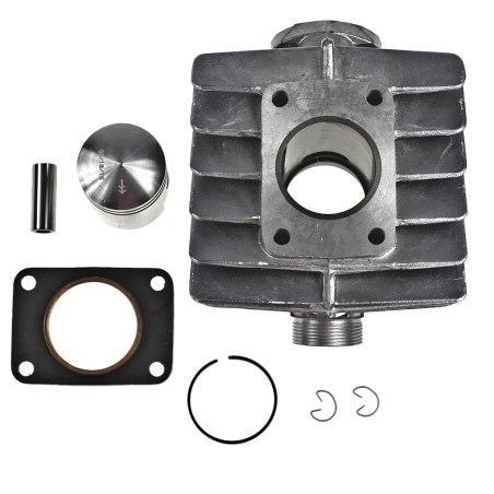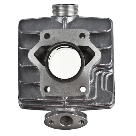 Cylinder do skuterów 2T chłodzonych powietrzem (AC) na sworzeń tłoka 10mm (w dwóch płaszczyznach kąt wyjścia do wydechu)W skład zestawu wchodzą: cylinder, tłok, pierscienie, sworzeń 10mm, zabezpieczenia sworznia, uszczelki.