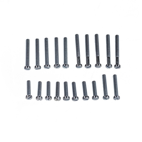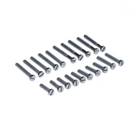 Komplet ocynkowanych śrub silnika S38, do motorowerów Komar. Komplet obejmuje śruby: głowicy, pokrywy sprzęgła oraz zapłonu, gaźnika, instalacji elektrycznej, wału korbowego, automatu zmiany biegów, dźwigni startera. Śruby z łbem na wkrętak płaski.