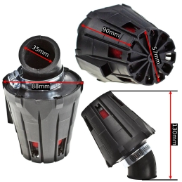 Filtr powietrza stożkowy średnica: 35mm, kąt: 90 stopni, materiał: siatkaWymiary stożka: średnica dolna: mm, średnica górna: mm, wysokość: mmFiltr stożkowy niski.