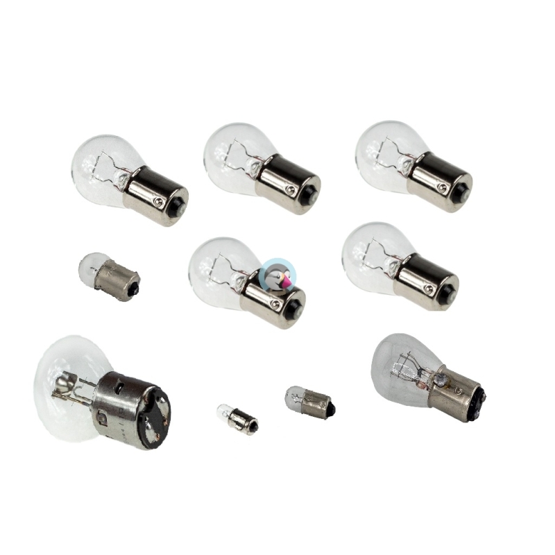 Kompletny zestaw żarówek do motocykli MZ TS125, TS150, TS250 oraz motorowerów Simson S51, SR50 Skuter. Zestaw dedykowany do okrągłych jak i prostokątnych kierunkowskazów oraz do obu rodzaju tylnych lamp. Instalacja 6V.
