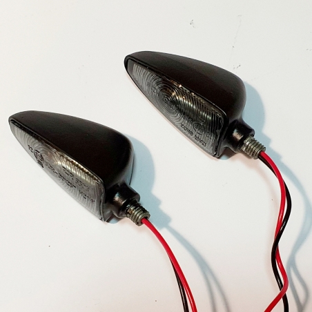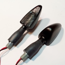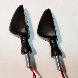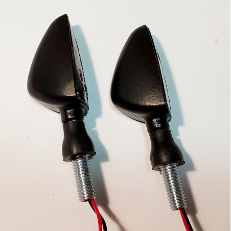 Komplet dwóch kierunkowskazów LED plastikowych w kolorze czarnym, szkło transaparentne, wzór łuski AM1382.Kierunkowskazy posiadają homologację.Wymiary: gwint M10, długość całkowita 10cm Uwagi: LED, homologacja