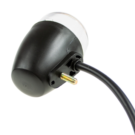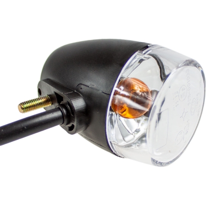 Kierunkowskaz, czarny, owalny. Klosz pomarańczowy. Homologacja E11.Miejsce montażu: lewy przód, prawy tył.Żarówka 12V 10W. Długość całkowita kierunkowskazu: 118mm.Gwint: M10x1,25