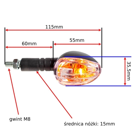Kierunkowskaz Mini strzałka - szkło pomarańczowe, kierunkowskaz czarny.Miejsce montażu: prawy przód, lewy tyłKierunkowskaz jest z żarówką 12V 23W.Kierunkowskaz nie posiada homologacji.