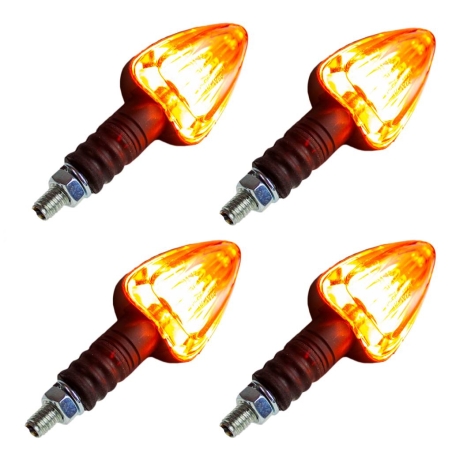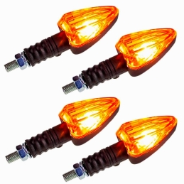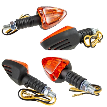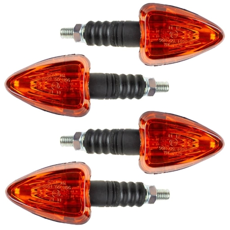 Zestaw 4 sztuk kierunkowskazów Mini Rekin, w czarnej obudowie z wysokiej jakosci tworzywa, odpornego na uderzenia, z pomarańczowym kloszem, do zastosowania w każdym motocyklu, motorowerze, ATV.