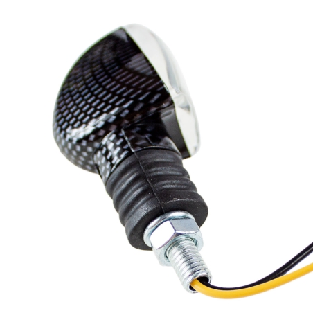 Kierunkowskaz uniwersalny, mini strzałka, carbon z przeźroczystym kloszem. Do zastosowania w każdym motocyklu, motorowerze, ATV. Gumowy amortyzator, tłumiący drgania przenoszone z ramy i silnika motocykla. Łatwa wymiana klosza, odkręcamy jedną małą śrubkę z tyłu kierunkowskazu, i ściągamy cały klosz oraz tylną część z kierunkowskazu oprawki żarówki. Kierunkowskaz wykonany z bardzo dobrej jakości materiałów.