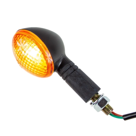 Kierunkowskaz, czarny, owalny. Klosz pomarańczowy. Homologacja E11.Miejsce montażu: lewy przód, prawy tył.Żarówka 12V 10W. Długość całkowita kierunkowskazu: 118mm.Gwint: M10x1,25
