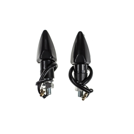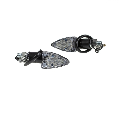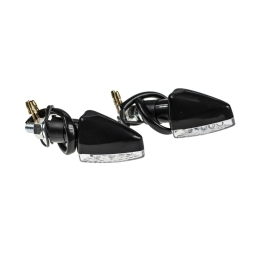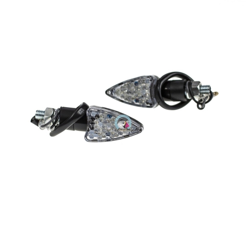 Komplet dwóch kierunkowskazów LED plastikowych w kolorze czarnym, szkło transaparentne, wzór łuski AM1382.Kierunkowskazy posiadają homologację.Wymiary: gwint M10, długość całkowita 10cm Uwagi: LED, homologacja