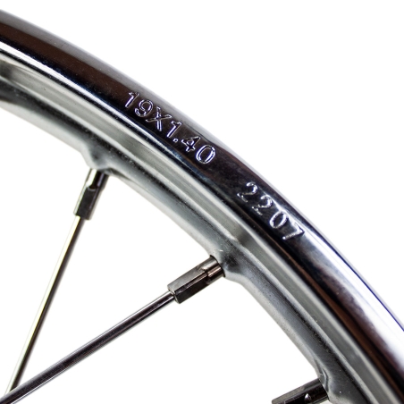Wysokiej jakości zestaw obręczy chromowanych, stalowych, w rozmiarze 19 cali, szerokości 1,35", bez graweru bocznego z rozmiarem ze szprychami ocynkowanymi. Zestaw dedykowany do motorowerów Romet Komar Sztywniak, oraz Żak i Ryś.
