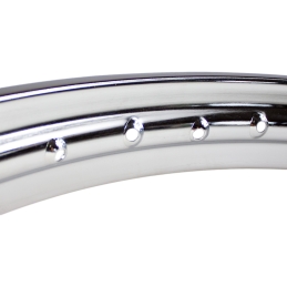 Wysokiej jakości obręcz chromowana, stalowa, o rozmiarze 19 cali, szerokości 1,35", bez graweru bocznego z rozmiarem obręczy,dedykowana do motorowerów Romet Komar ŻaK Ryś