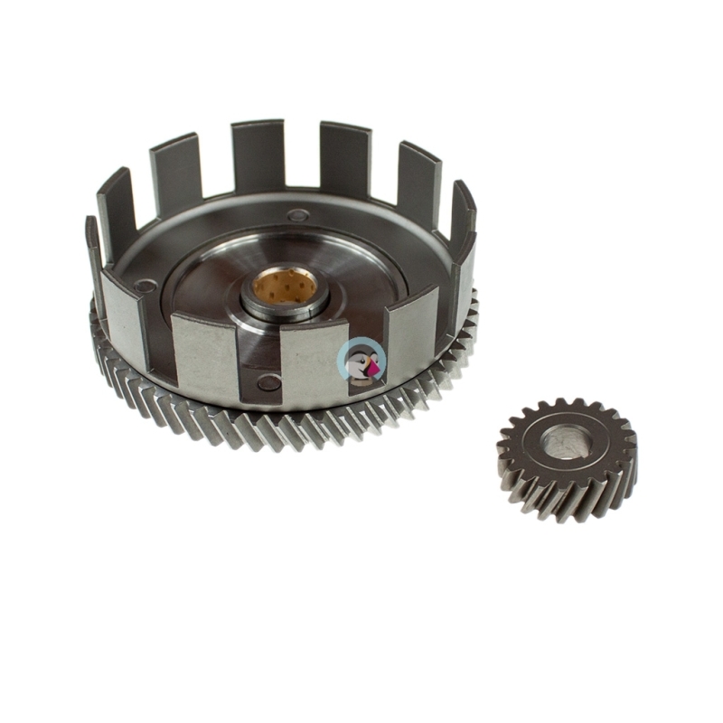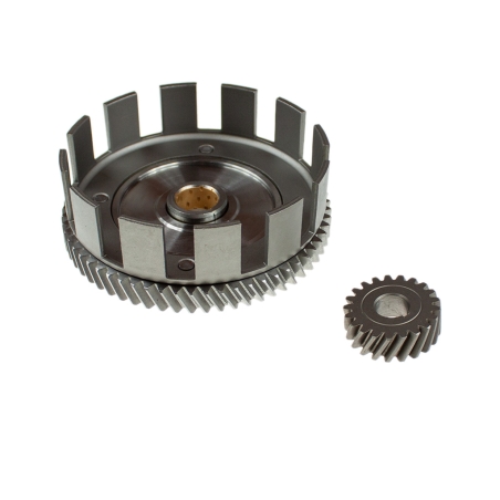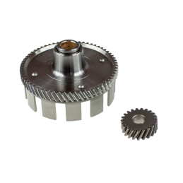 Kosz sprzęgłowy, z małą, skośną zębatką do wału korobowego, do motorowerów Simson S51 S70Ilość zębów na koszu: 62 zęby ; Ilość zębów zębatki skośnej na wale: 21 zębów.Produkt najwyższej jakości Duells.