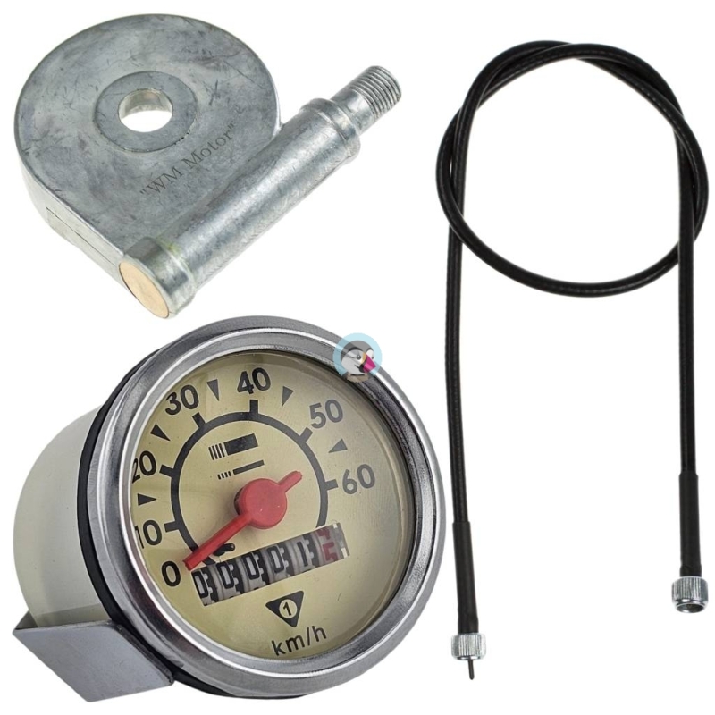 Kompletny zestaw licznika z napędem oraz linką prędkościomierza, do motorowerów Romet, Komar, Ogar200, Ogar205, Kadet, 50-T-1.