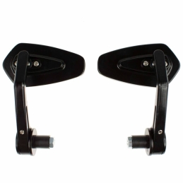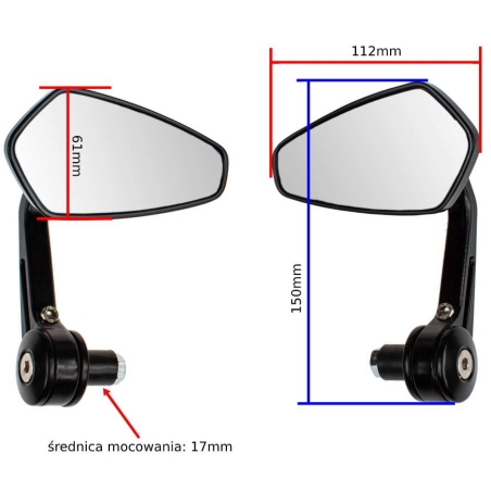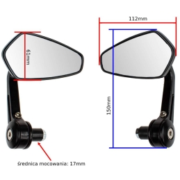 Zestaw lusterek metalowych, czarnych, montowanych w kierownicę.Lusterka są w pełni regulowane. Zawias trzyma lusterko na zabezpieczeniu kulowym.Średnica wewnętrzna kierownicy: 13mm lub 17mmWymiary: dokładne wymiary podane na jednym ze zdjeć.
