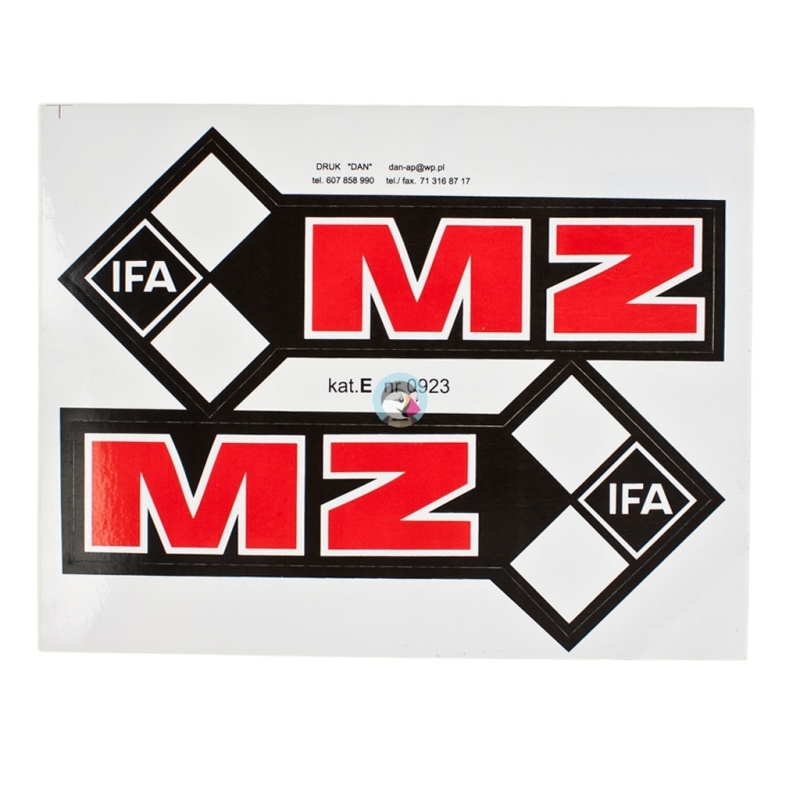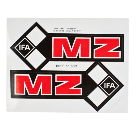 Naklejki zbiornika paliwa do motocykli MZ ETZ250. Napis "MZ" czerwony, czarne tło, obwódka napisu biała. W komplecie są dwie sztuki na prawą i lewą stronę zbiornika.