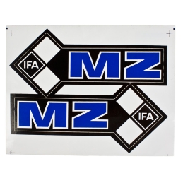 Naklejki zbiornika paliwa do motocykli MZ ETZ250. Napis "MZ" niebieski, czarne tło, obwódka napisu biała. W komplecie są dwie sztuki na prawą i lewą stronę zbiornika.