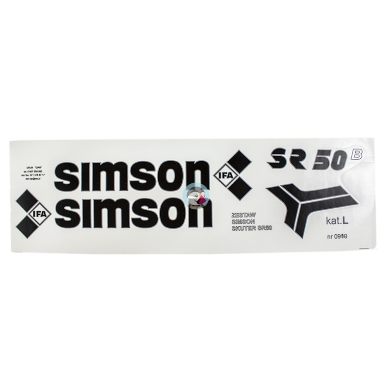 Komplet naklejek koloru czarnego do motorowerów Simson SR50, do wersji "B". Zestaw zawiera dwie naklejki na ramkę motoroweru oraz jedną na osłonę nóg. Naklejki wysokiej jakości, produkcji polskiej, zgodne z wzorem oryginalnym.