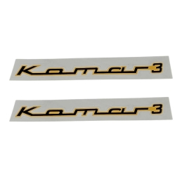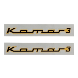 Komplet dwóch sztuk naklejek zbiornika paliwa, do motorowerów Komar 3. Napis "Komar 3" czarny, w żółtej obwódce.