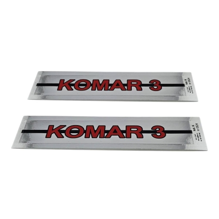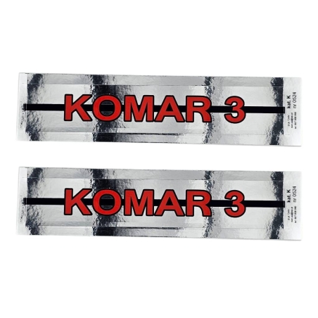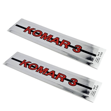 Komplet dwóch naklejek na zbiornik paliwa, do motorowerów Romet Komar 3. Napis na naklejce w kolorze czerwonym, tło chromowane. Napis był w tym samym kolorze co kolor motorowerów.