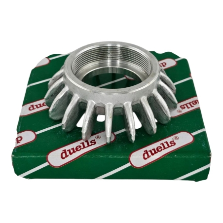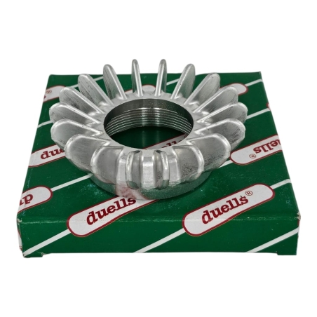 Nakrętka łącząca kolanko wydechowe z cylindrem, posiadające duże żebra, do motocykli Jawa 250 353 Kyvacka, Jawa 250 350 Perak, Jawa 350 354, 360. Nakrętka ocynkowana. Produkt wysokiej jakości Duells.
