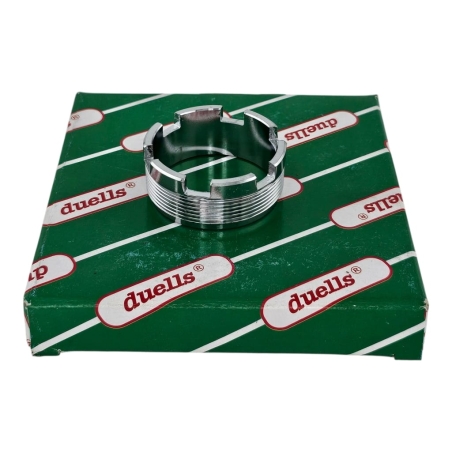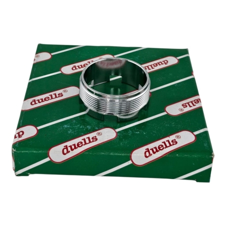 Nakrętka łącząca kolanko wydechowe z cylindrem, chromowana, do motocykli Jawa 350 typ 634 6V, CZ350 typ 472. Produkt wysokiej jakości Duells.