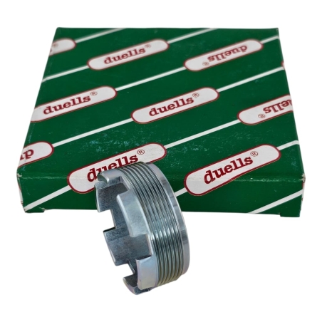Nakrętka łącząca kolanko wydechowe z cylindrem, posiadające duże żebra, do motocykli Jawa 250 353 Kyvacka, Jawa 250 350 Perak, Jawa 350 354, 360. Nakrętka ocynkowana. Produkt wysokiej jakości Duells.