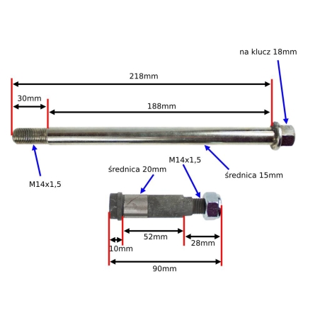 Długośc całkowita długiej osi: 218mm, długość całkowita krótkiej osi: 90mm, średnica długiej osi: 15mm