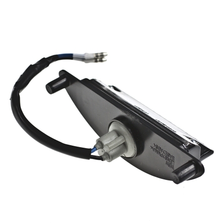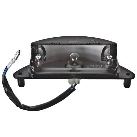 Oświetlenie tablicy rejestracyjnej, czarne, z homologacją. Szerokość od śruby do sruby: 45mm. Wysokość 20,5mm, Głębokość: 31mm. Oświetlenie przykręcane poprzez dwa blachowkręty od tyłu, prostopadle do tablicy.