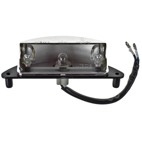 Oświetlenie tablicy rejestracyjnej, czarne, z homologacją. Szerokość od śruby do sruby: 110mm. WysokośćL 35mm, Głębokość: 42mm. Oświetlenie może być zamocowane za uchwytem do tablicy, bez urzycia nakrętek.W zestawie żarówka 12V 5W.