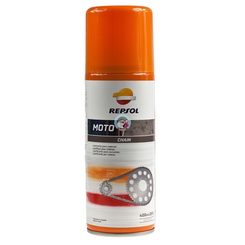 Smar do łańcuchów motocyklowych Repsol Moto Chain. Wydajny smar najlepszych zawodników MotoGp. Doskonale smaruje penetrując nawet najbardziej niedostępne części rolek łańcucha napędowego.