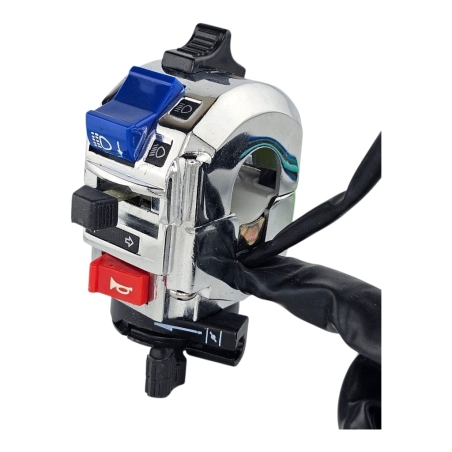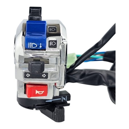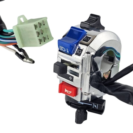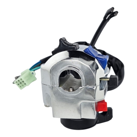 Przełącznik zespolony, lewy, do pojazdów typu ATV.Zawiera w sobie, światła mijania i drogowe oraz blenda, klakson, kierunkowskazy, śwaitła awaryjne, dźwignię ssania ręcznego. Podłączenie 7 pinów w kostce + 1 pin konektor rurkowy.