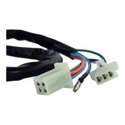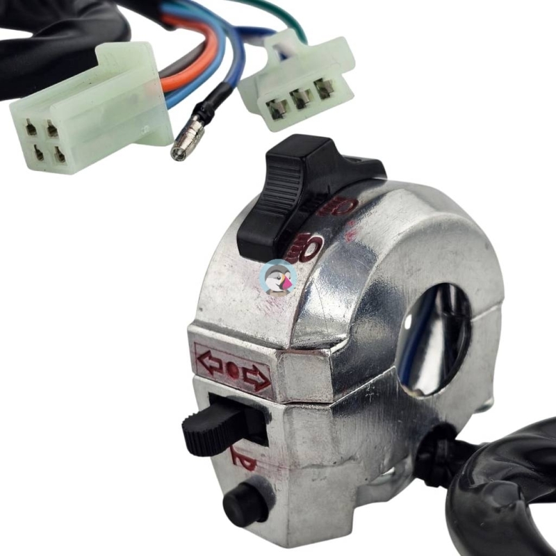 Przełącznik zespolony, lewy, do pojazdów typu ATV.Zawiera w sobie, światła mijania i drogowe oraz blenda, klakson, kierunkowskazy, śwaitła awaryjne, dźwignię ssania ręcznego. Podłączenie 7 pinów w kostce + 1 pin konektor rurkowy.