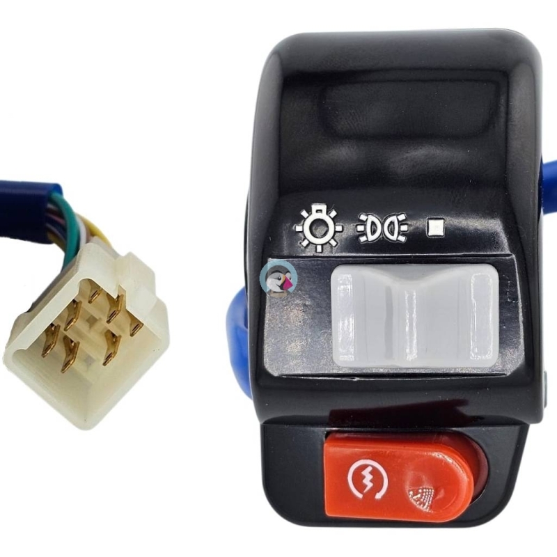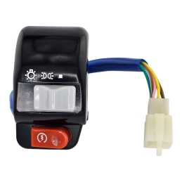 Przełącznik świateł drogowych i mijania, monotwany w owiewce na kierwonicy. Dodatkowo jest przycisk flesz.Podłączenie: 4 piny, w jednej kostce.Pasuje m.in. do skuterów produkcji chińskiej 2T i 4T 139QMB