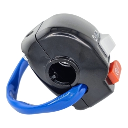 Przełącznik zawiera: korpus manetki gazu do linki zakończonej gwintem, przełącznik świateł - wyłączone - pozycyjne - mijania, oraz włącznik rozrusznika. Miejsce na lusterko - gwint M8 prawy
