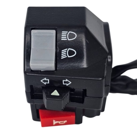Przełącznik świateł drogowych i mijania, monotwany w owiewce na kierwonicy. Dodatkowo jest przycisk flesz.Podłączenie: 4 piny, w jednej kostce.Pasuje m.in. do skuterów produkcji chińskiej 2T i 4T 139QMB