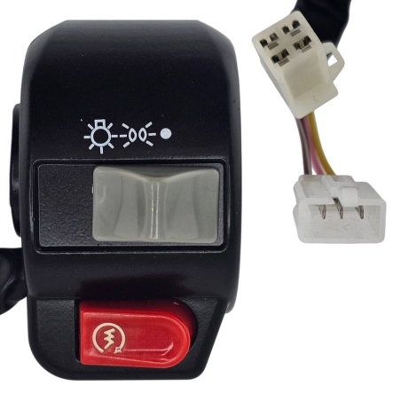 Przełącznik świateł drogowych i mijania, monotwany w owiewce na kierwonicy. Dodatkowo jest przycisk flesz.Podłączenie: 4 piny, w jednej kostce.Pasuje m.in. do skuterów produkcji chińskiej 2T i 4T 139QMB