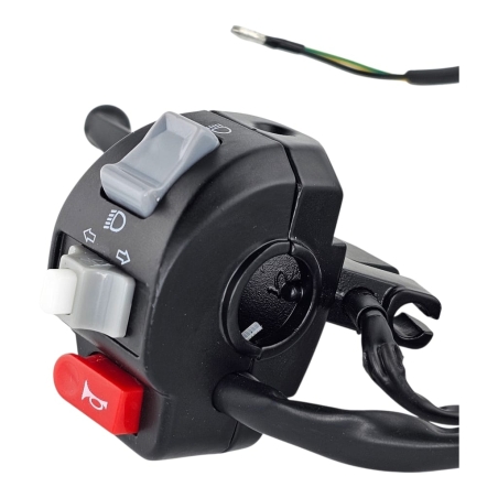 Przełącznik zawiera: włącznik klaksonu, przełącznik kierunkowskazów, przełącznik świateł długie - krótkie. Miejsce na lusterko - gwint M8 prawy