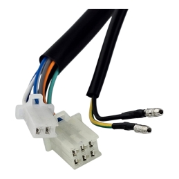 Przełącznik zespolony prawy PY-5 z kostką męską 6 pinów + 4 piny rurkowe + 2 kontektowy żeńskie. Przełacznik zawiera korpus manetki gazu do linki na dwa listki montażowe. Światła wyłączone - pozycyjne - mijania, wyłącznik zapłonu + włącznik rozrusznika.