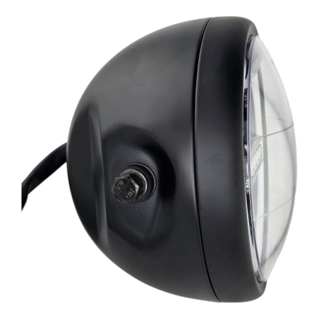 Reflektor motocyklowy 7cali, z homologacją. Model British Style czarny. Mocowania reflektora po bokach. Średnica reflektora 200mm. Głębokość 80mm od mocowania. Miejsce na żarówkę: H4. Światła długie, krótkie, postojowe. Materiał metal. Szybka z pryzmatem.