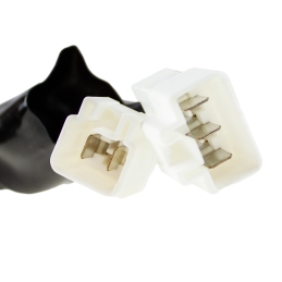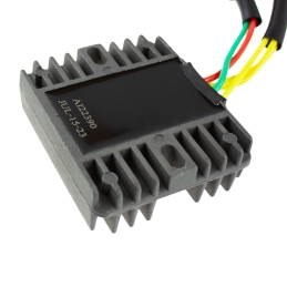 Regulator napięcia - pięć pinów. Cztery piny żeńskie w kostce, jeden osobno na konektorze rurowym męskim. Kolory przewodów: czarny, czerwony, pomarańczowy, zielony, żółty.