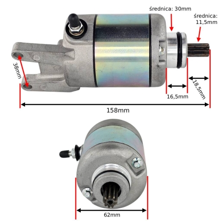 Rozrusznik, do skuterów Kinroad Kos XT50QT-5, z bendiksem rozrusznika.Wymiary: rozstaw śrub: 72mm