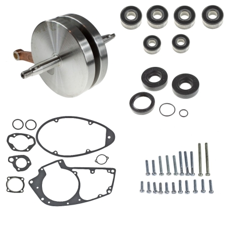 Bogaty zestaw naprawczy silnika obejmujący: wał korobowy Romet 2B 017, 023 Duells, cylinder Almot, zestaw uszczelek Delux, zestaw uszczelniaczy, zestaw łożysk Nachi, nakrętki i zabepieczenia na wał, śruby silnika, klin wału.