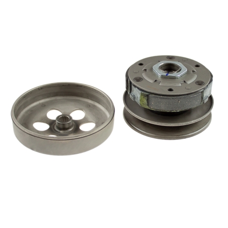 Kompletne sprzęgło odśrodkowe, z dzwonem, korektorem momentu obrotowego, sprężynami, łożyskami itd. Złożone i gotowe do montażu.Pasuje do maxiskuterów produkcji azajtyckiej z silnikami 152QMI 125cm3 i 150cm3 oraz do maxiskuterów Peougeto, SYM, Kymco.