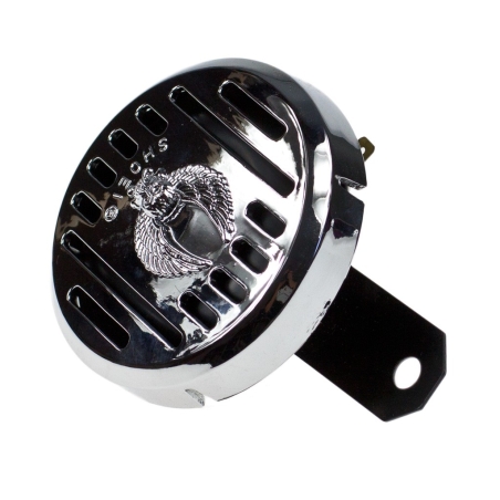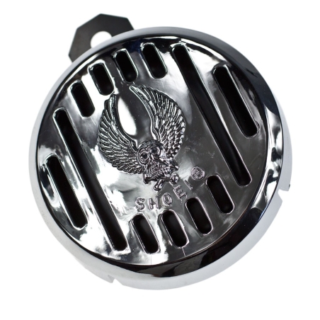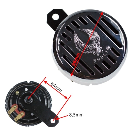 Klakson motocyklowy, 6V, średnica 96mm.Plastikowa nakładka chromowana z przetłoczeniem - orzeł ze skrzydłami.